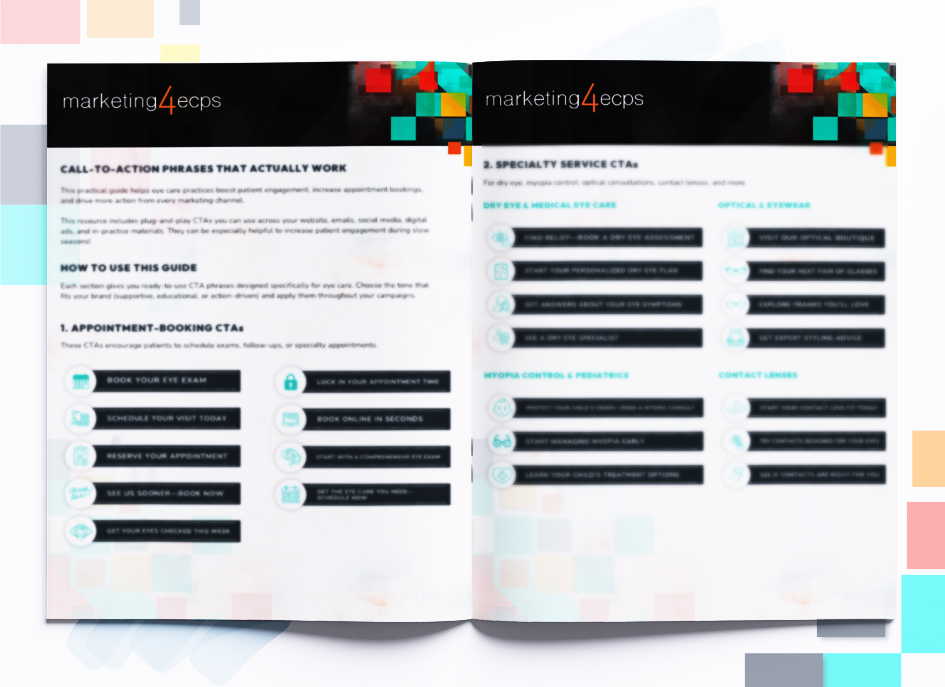 You’ll find CTAs for every part of your marketing, including your website, emails, social media, digital ads, and in-practice materials. The guide covers appointment booking, specialty services, optical, contact lenses, trust-building, and even seasonal slowdown messaging.